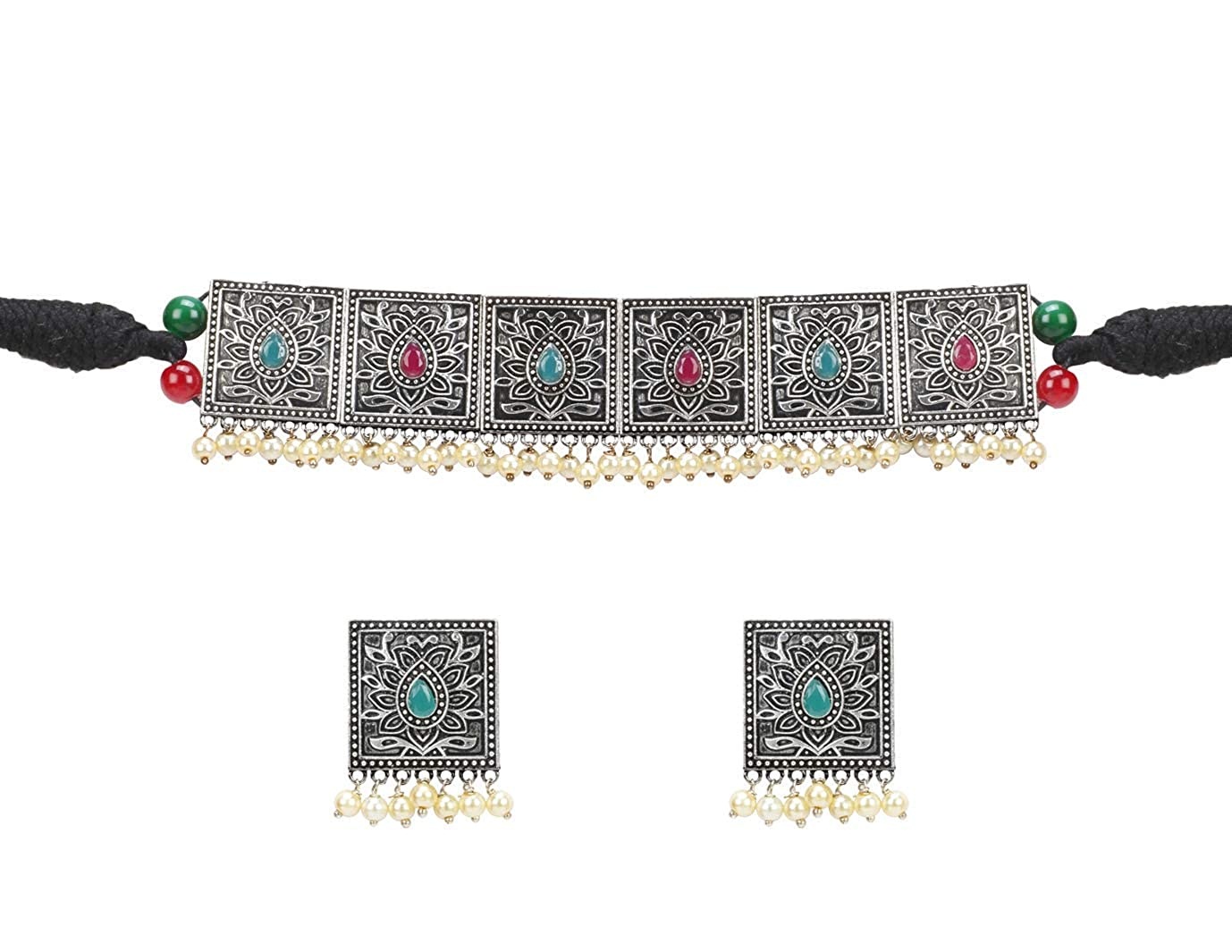 - Classic look Silver Oxidised Necklace set with Jhumka earrings for women to wear,