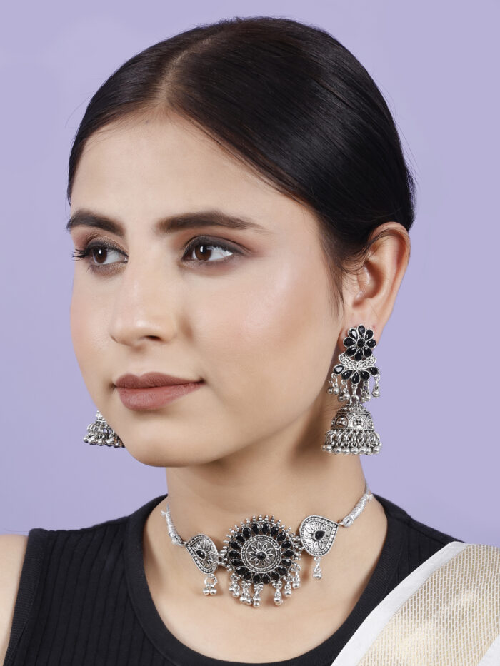 - Classic look Silver Oxidised Necklace set with Jhumka earrings for women to wear,