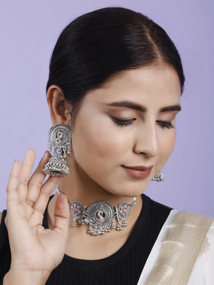- Classic look Silver Oxidised Necklace set with Jhumka earrings for women to wear,