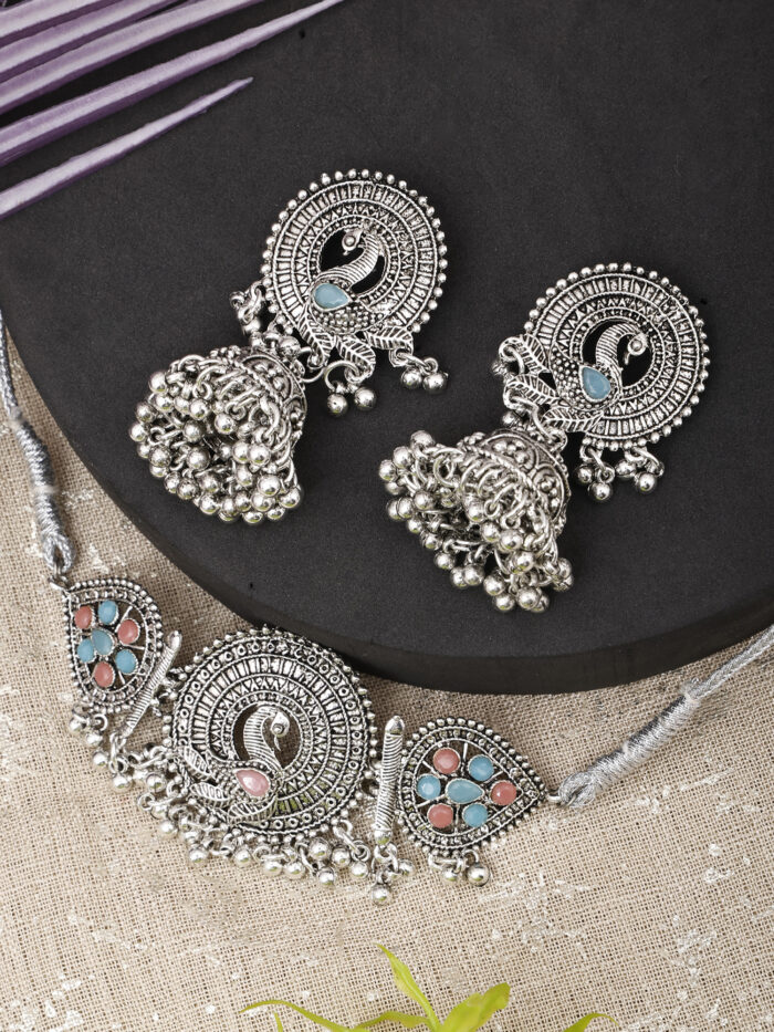 - Classic look Silver Oxidised Necklace set with Jhumka earrings for women to wear,