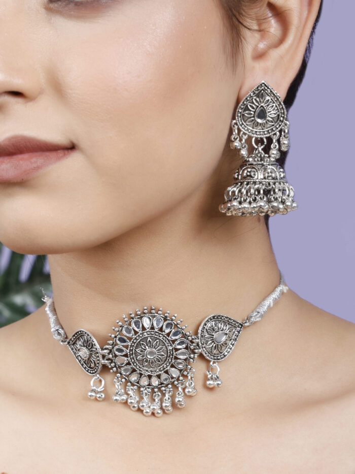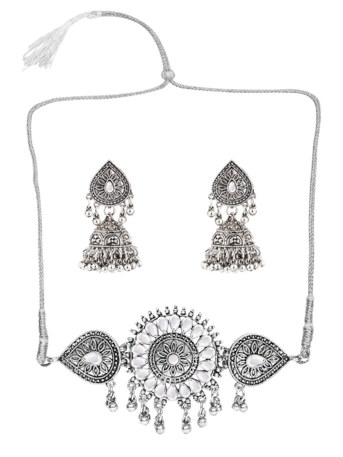 - Classic look Silver Oxidised Necklace set with Jhumka earrings for women to wear,