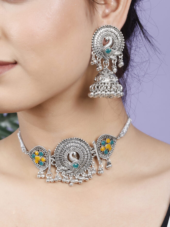 - Classic look Silver Oxidised Necklace set with Jhumka earrings for women to wear,