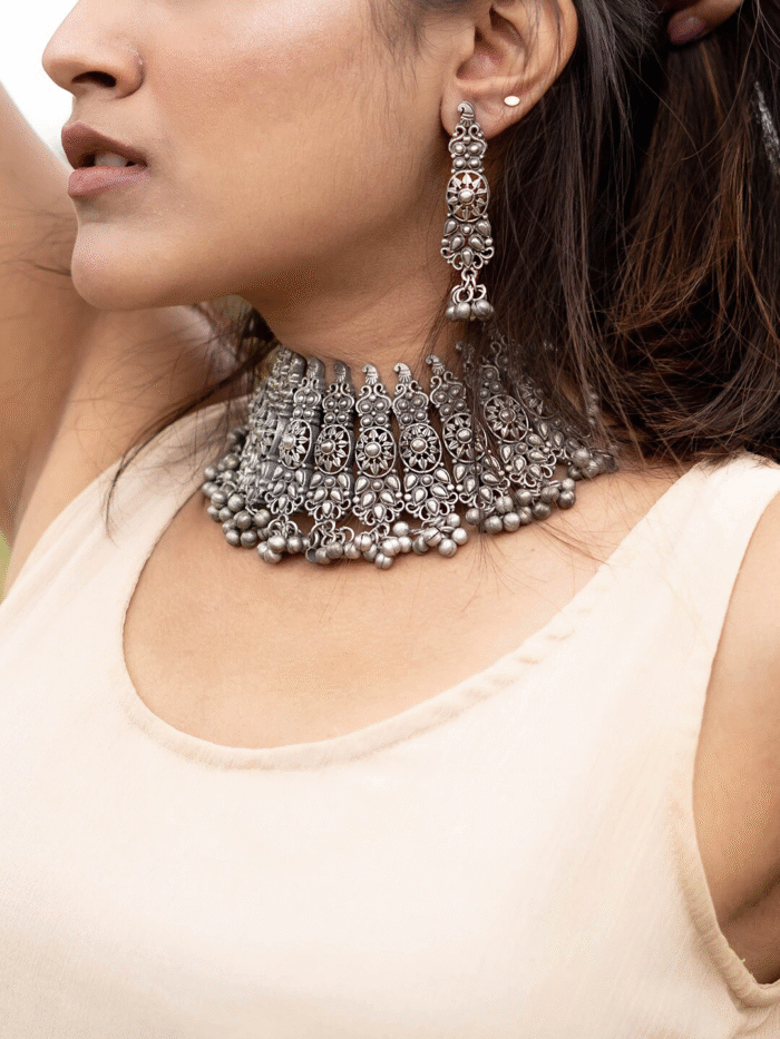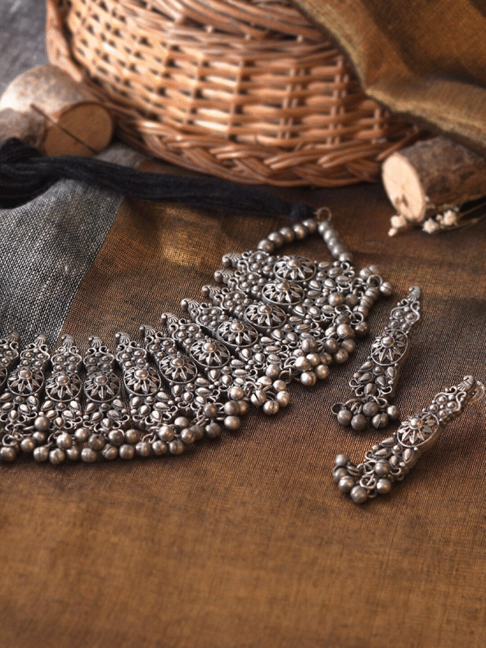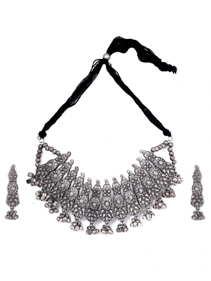 - Classic look Silver Oxidised Necklace set with Jhumka earrings for women to wear,