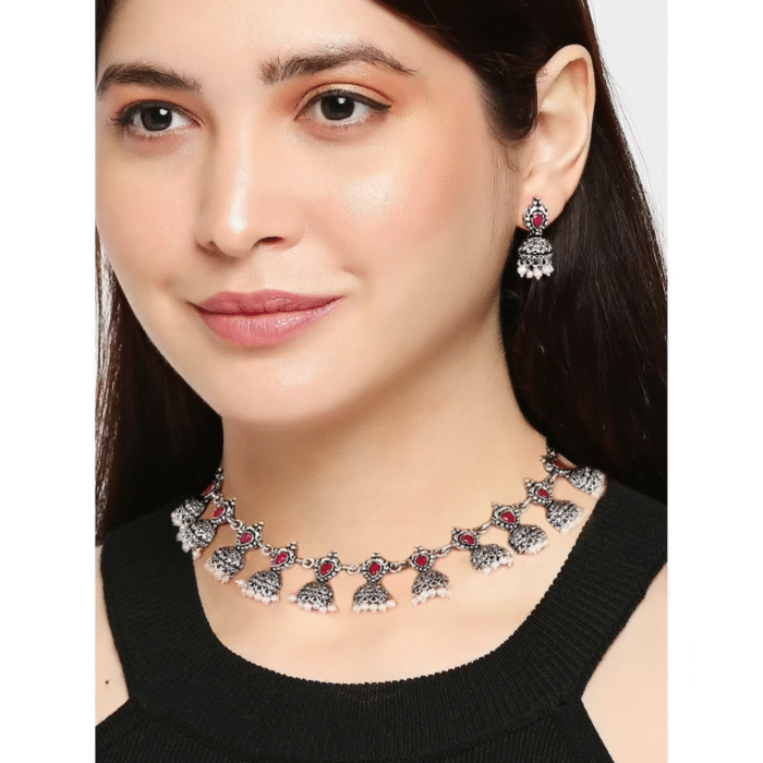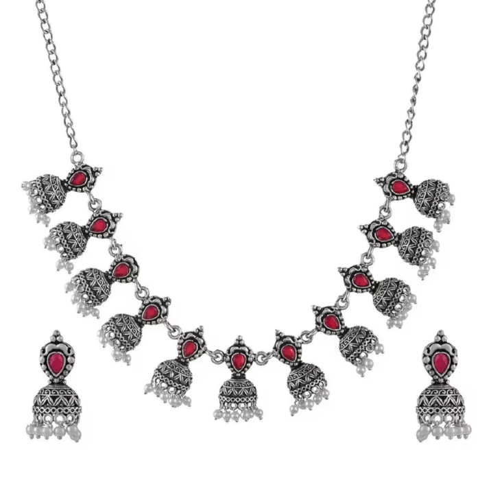- Classic look Silver Oxidised Necklace set with Jhumka earrings for women to wear,